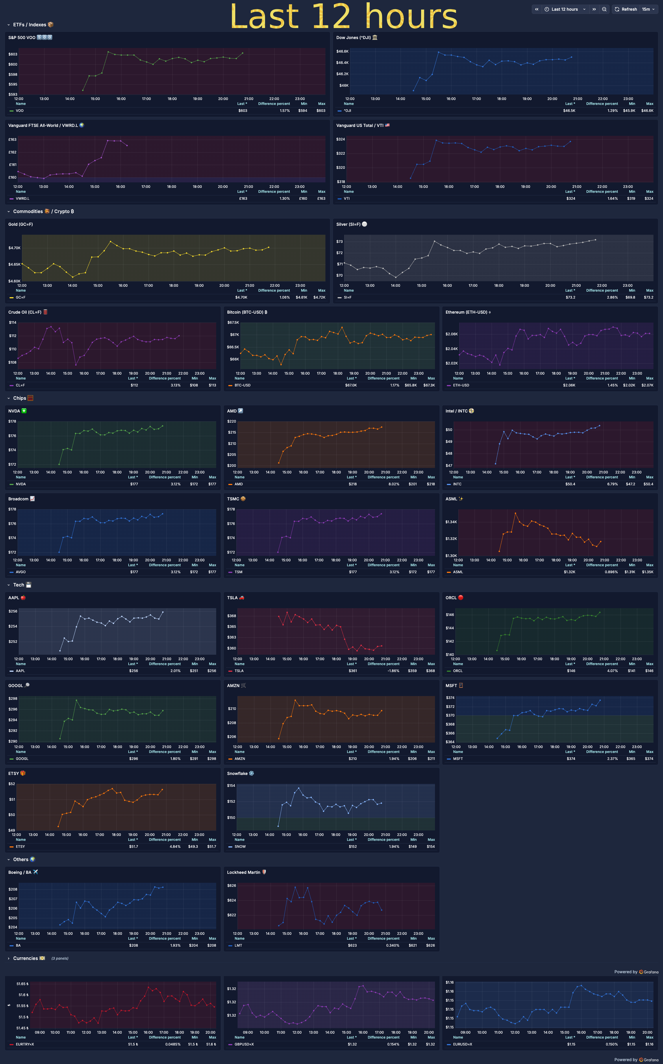 - Pre-built Grafana dashboards — 5 sections (ETFs, Commodities, Chips, Tech, Currencies), shared crosshair, and example alert rules.