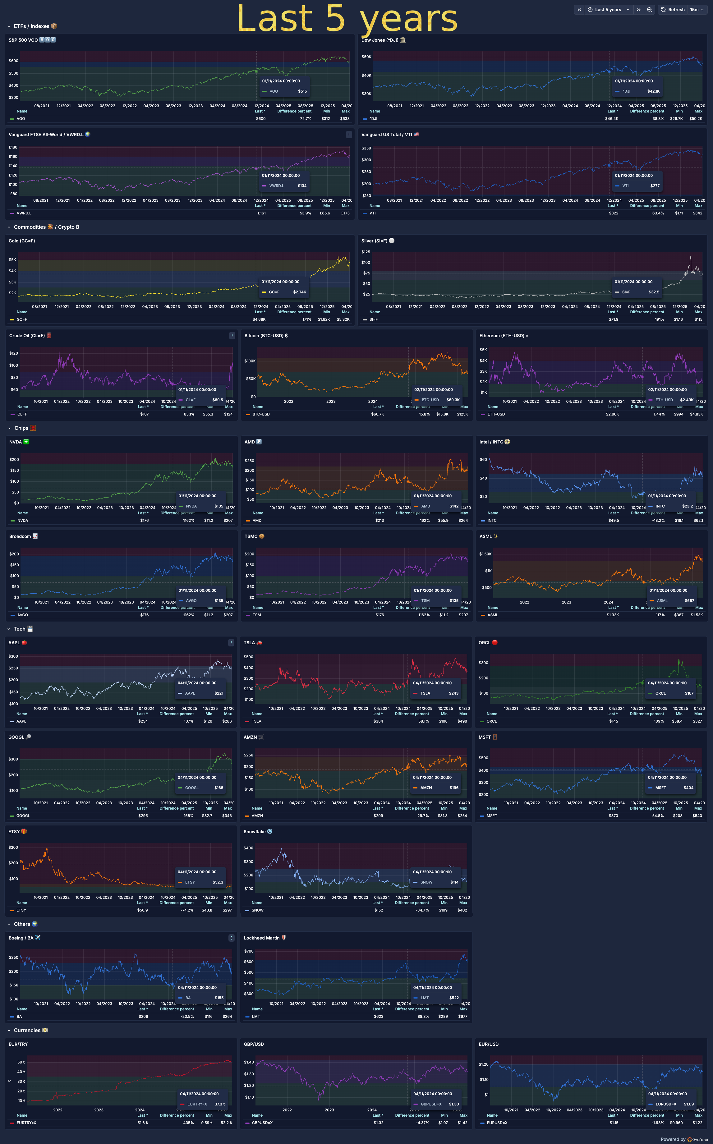 I wanted a single dashboard where I could see everything I track — S&P 500, gold, NVIDIA, Bitcoin, EUR/TRY — at a glance. Without stitching together free-tier widgets or juggling multiple apps. And I wanted history: not just today's price, but 5 or 10 years of data I can query however I like.